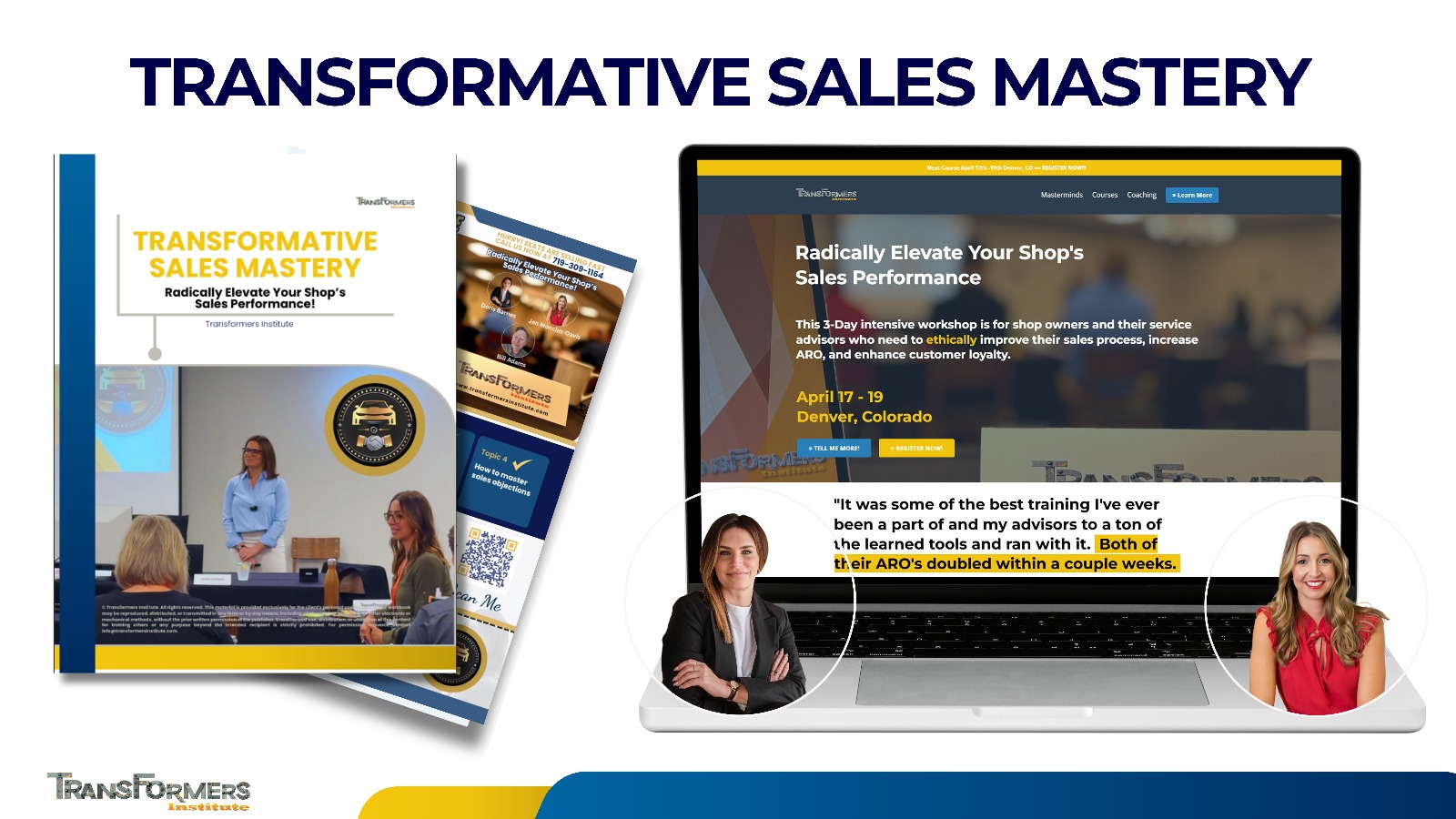 Increase Car Count, Margin, ARO (Average Repair Order), Retention and reviews. Discover the secrets to unlocking explosive growth in your auto shop with the 'Transformative Sales Mastery: Auto Shop Growth Workshop. In just three transformational days, you'll embark on a journey to sales excellence, mastering the art of trust-based selling.