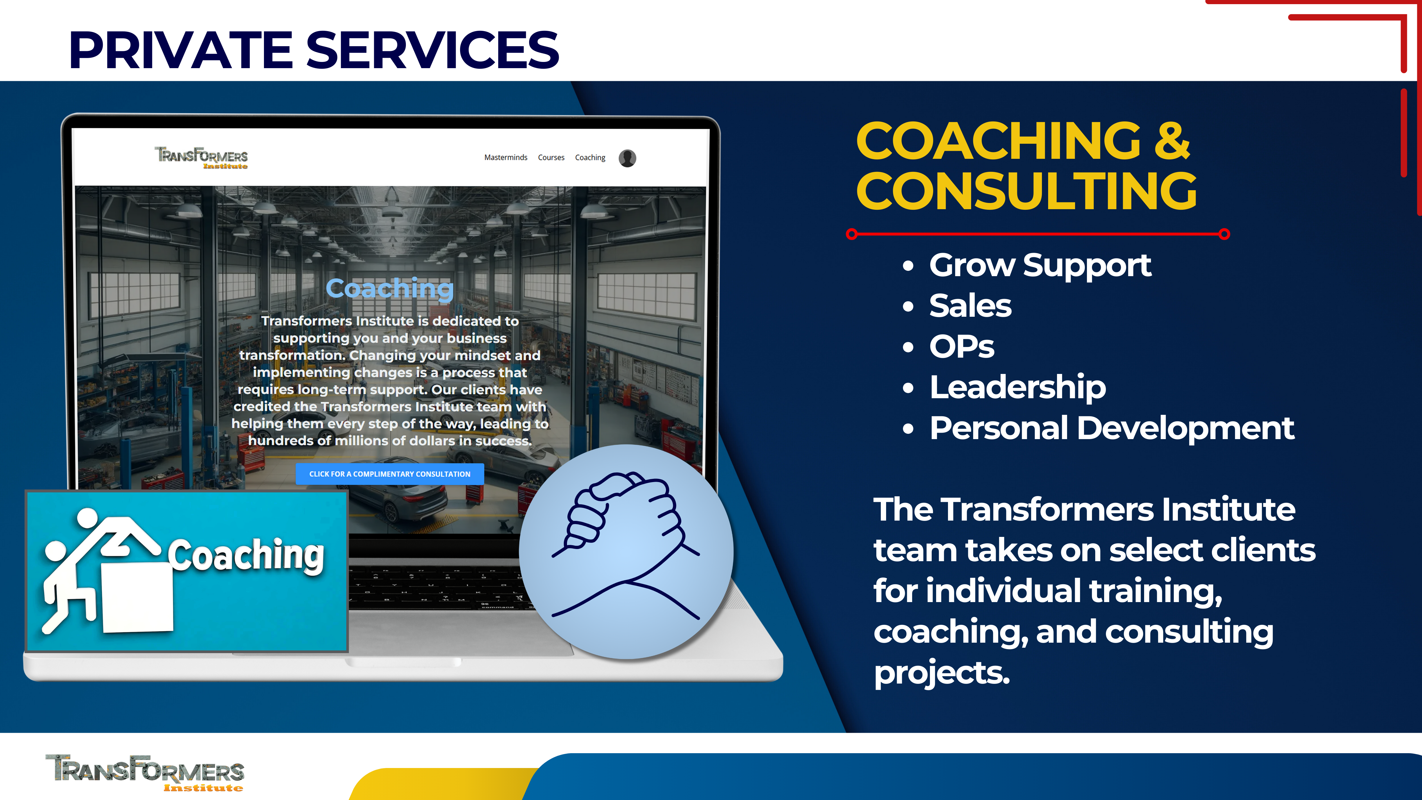 The Transformers Institute team takes on select clients for individual training, coaching, and consulting projects.