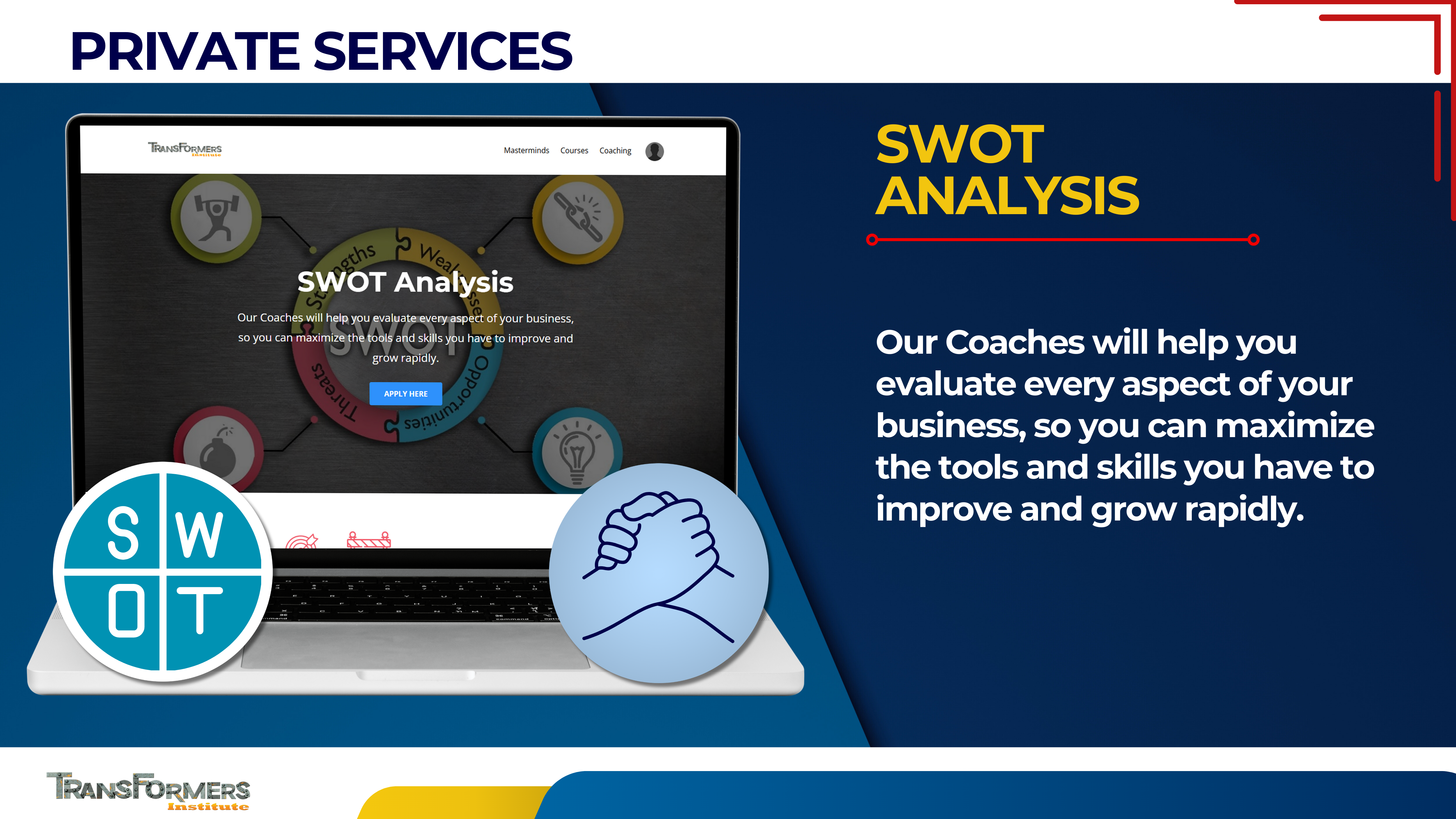 The Transformers Institute team takes on a limited amount of clients to perform an on-site deep SWOT analysis: Two TI team members spend 1.5 days on-site with your team. We perform a Strengths, Weaknesses, Opportunities, and Threats analysis.