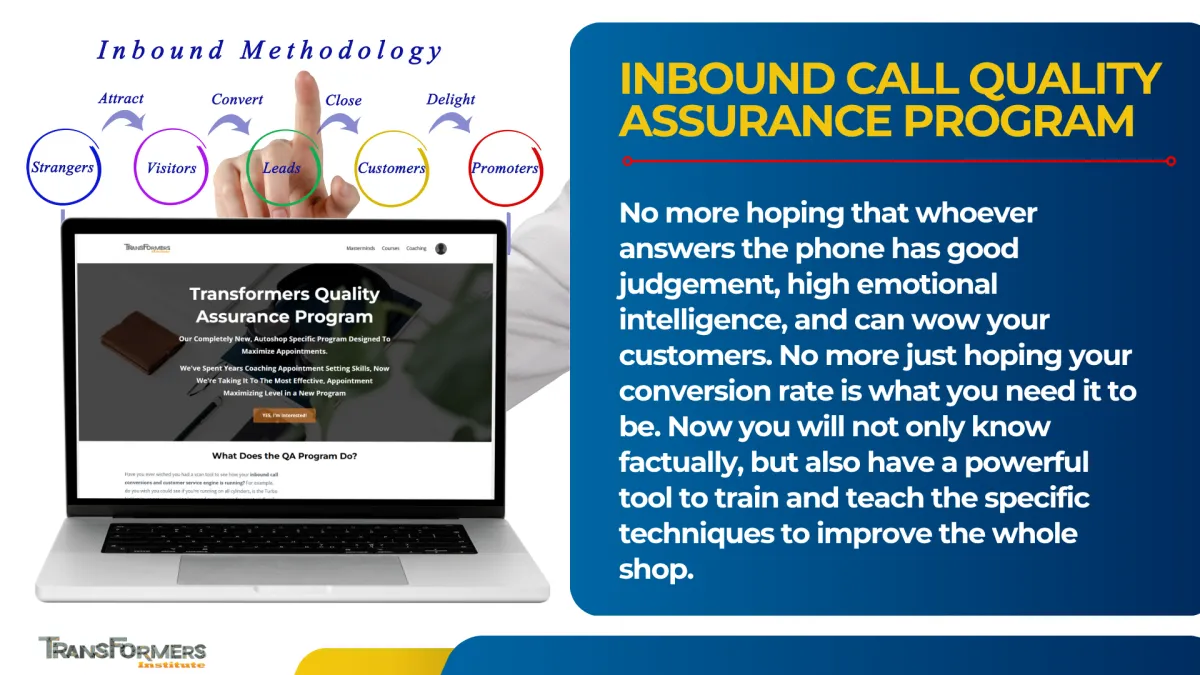 Transformers Institute's Inbound Call Quality Assurance Program is the ultimate diagnostic tool for shop owners who are done guessing and ready to master their inbound sales performance. Built specifically for the auto repair industry, this program audits real customer calls, uncovers the hidden mistakes costing you appointments, and delivers data-driven insights you can act on immediately. With 50+ measurable data points per call, expert analysis, and executive summaries, you'll finally know how your team performs on the phones and how to fix what's broken. No more "hoping" your calls convert. With Transformers QA, you'll turn your phones into your #1 sales engine.
